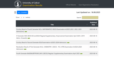 Calicut University result 2025: The University of Calicut has released the Calicut University Result 2025 for the B.Ed second semester and M.Sc Chemistry third semester examinations today, on August 16, 2025. Candidates can now access the scrutiny result for the second semester B.Ed Exam (4/2025) and the revaluation result for the third semester M.Sc Chemistry OTRS Exam (9/2024) through the official website uoc.ac.in.The latest announcement comes just days after the University declared multiple results on August 14, 2025. These included the fourth-semester scrutiny results for M.A Economics, M.Sc Chemistry, M.Sc Botany, and Master of Social Work programmes. Alongside, results for the fourth semester B.Ed Special Education and supply exams for BA, BSW, BTFP, BVC, and AFU courses were also made available.