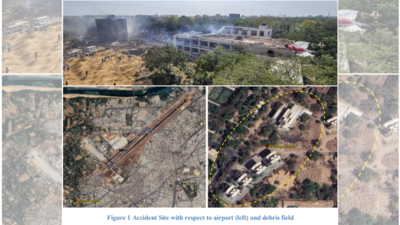 NEW DELHI: The crash of Air India flight AI 171 on June 12 has been traced back to a sudden and unexplained fuel cutoff to both engines just three seconds after takeoff from Ahmedabad, the Aircraft Accident Investigation Bureau (AAIB) has revealed in its preliminary report. The report, released Saturday, includes a detailed timeline of the final moments of the London-bound Dreamliner, supported by critical images showing the impact trail, wreckage, and damage to key aircraft components.Images included in the report capture the dramatic descent of the Boeing 787 as it clipped treetops, an incineration chimney, and then collided with the BJ Medical College hostel building just 1.6 km from the runway. The aircraft, weighing 213.4 tons—nearly its maximum takeoff weight—never gained sufficient altitude after lift-off.“The aircraft achieved maximum recorded airspeed of 180 knots… and immediately thereafter, the engine 1 and engine 2 fuel cutoff switches transitioned from RUN to CUTOFF position one after another with a time gap of one second,” the report states. This caused both engine fan rotation speeds (N1 and N2) to fall below minimum idle, deploying the Ram Air Turbine (RAT), as captured in airport CCTV footage.