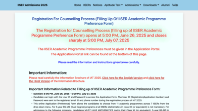 Candidates who have qualified the IISER Aptitude Test (IAT) 2025, results for which were declared on June 24, are eligible to participate in the ongoing counselling process. Students are advised to keep their login credentials and all necessary documents ready before proceeding with the registration.