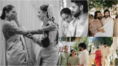 Akhil Akkineni and Zainab Ravdjee, an artist and businesswoman, are now officially married. The couple exchanged vows on June 6, 2025, in a deeply personal and heartfelt ceremony at the Akkineni family home in Hyderabad, surrounded by close friends and family.Unseen wedding pictures capture the love and warmthNew, unseen photographs from the wedding ceremony were shared by a photographer on Instagram, describing the celebration as “intimate, lovely, and full of heart.” The photos reflect pure joy, from Akhil’s radiant smile to Zainab’s glowing presence in bridal attire.One particularly adorable image shows Akhil’s pet dog, Drogo, receiving a kiss from Amala Akkineni as he joined in the wedding festivities. Akhil’s parents, superstar Nagarjuna and actor Amala, were seen beaming with pride as they blessed the newlyweds.Sobhita Dhulipala’s emotional bond with her sister-in-law steals the showAkhil’s brother Naga Chaitanya and his partner, actor Sobhita Dhulipala, were present throughout the festivities, sharing sweet and candid moments with the couple. In a heart-melting moment captured by the lens, Sobhita is seen looking emotional as she watches Zainab walk to the mandap for the wedding rituals.Another photo shows her holding Zainab’s hair as Akhil ties the mangalsutra, while a different frame captures her gently resting her chin on Chaitanya’s shoulder. The pictures speak volumes about the warm bond she shares with her sister-in-law.Tollywood royalty in attendanceThe wedding was graced by several industry stalwarts, including Ram Charan, Chiranjeevi, and director SS Rajamouli. His son, SS Karthikeya, was part of the bridal party, helping Zainab walk to the mandap in a touching display of support.Akhil and Zainab had kept their relationship away from the limelight until they announced their engagement on November 26, 2024. Sharing a joint Instagram post in coordinated white outfits, Akhil wrote: “Found my forever (infinity symbol). Happy to announce that Zainab Ravdjee and I are happily engaged.”