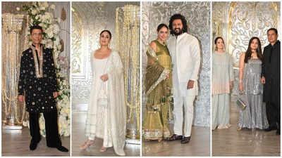 Veteran star Hema Malini brought timeless charm to the night in a pink saree paired with a silver cape that added a contemporary touch.Bollywood’s beloved couple Riteish Deshmukh and Genelia D’Souza brought their signature warmth to the party. Riteish opted for a crisp white outfit, while Genelia looked radiant in an olive-green saree.